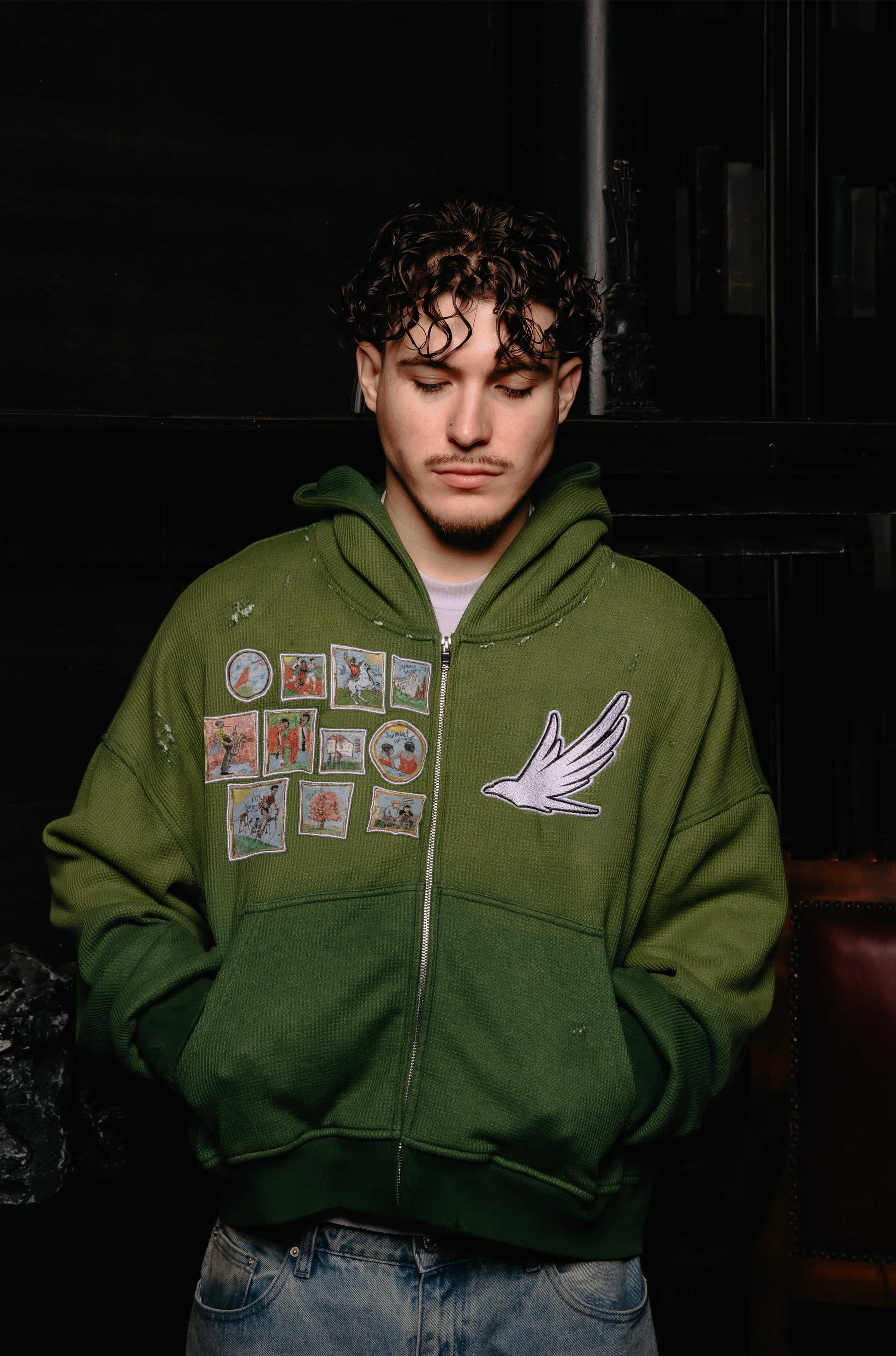 Curated in Turkey and constructed from premium heavyweight thermal fabric. Finished in a rich evergreen tone and detailed with embroidered heritage stamp patches across the chest, alongside Sumé’s signature dove emblem. Designed with a structured cropped silhouette, ribbed trims, and a full front zip closure for versatile wear.