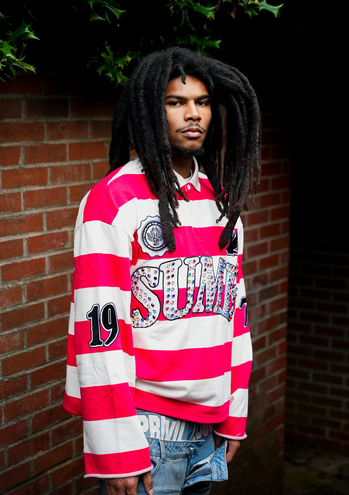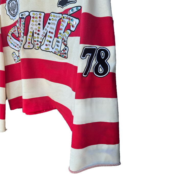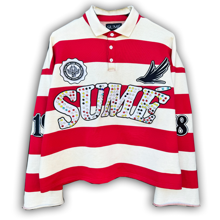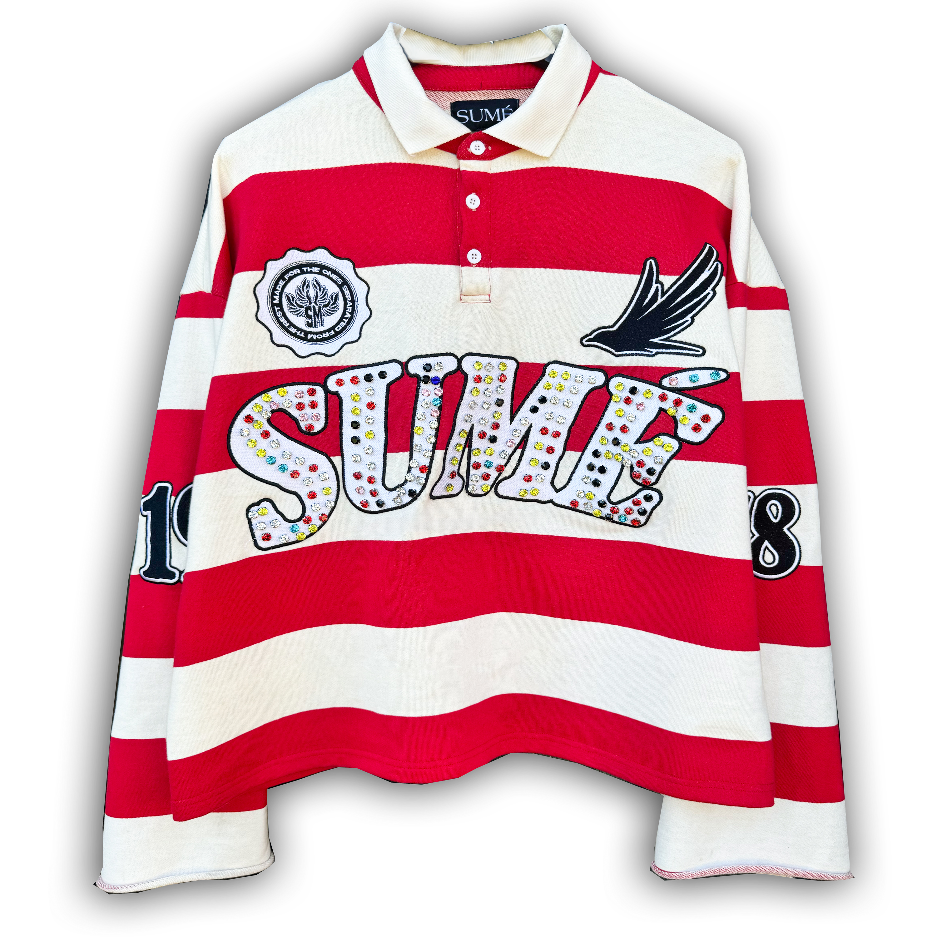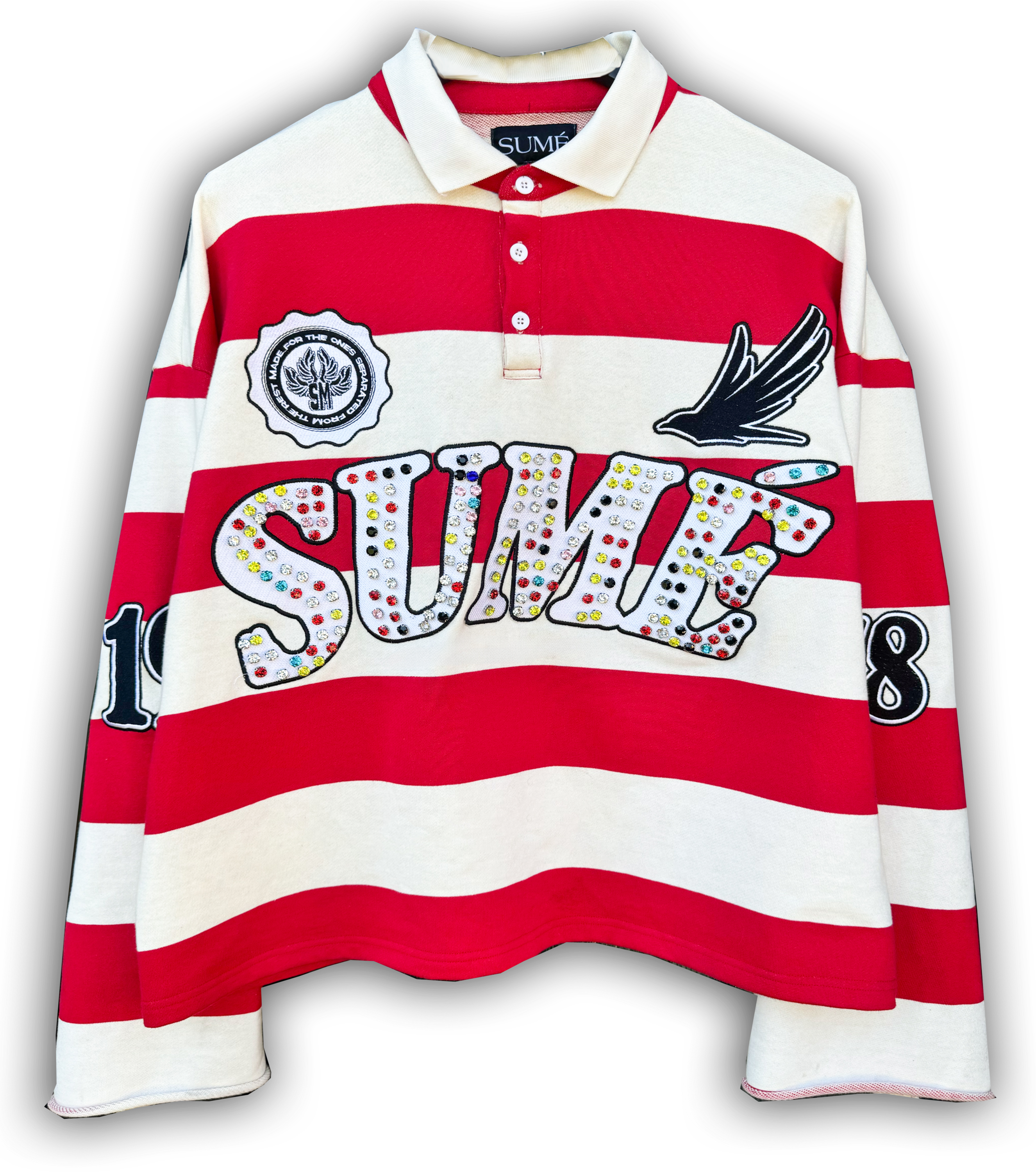 Design: Red and tan horizontal stripes with rhinestone-embellished Sumé logo