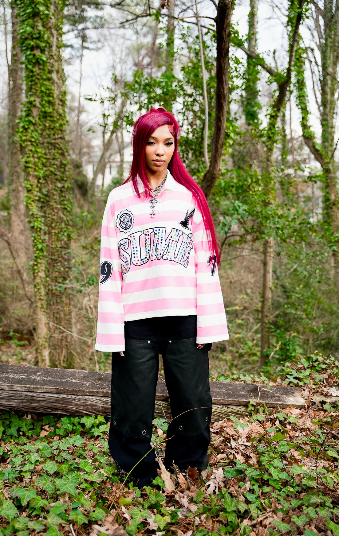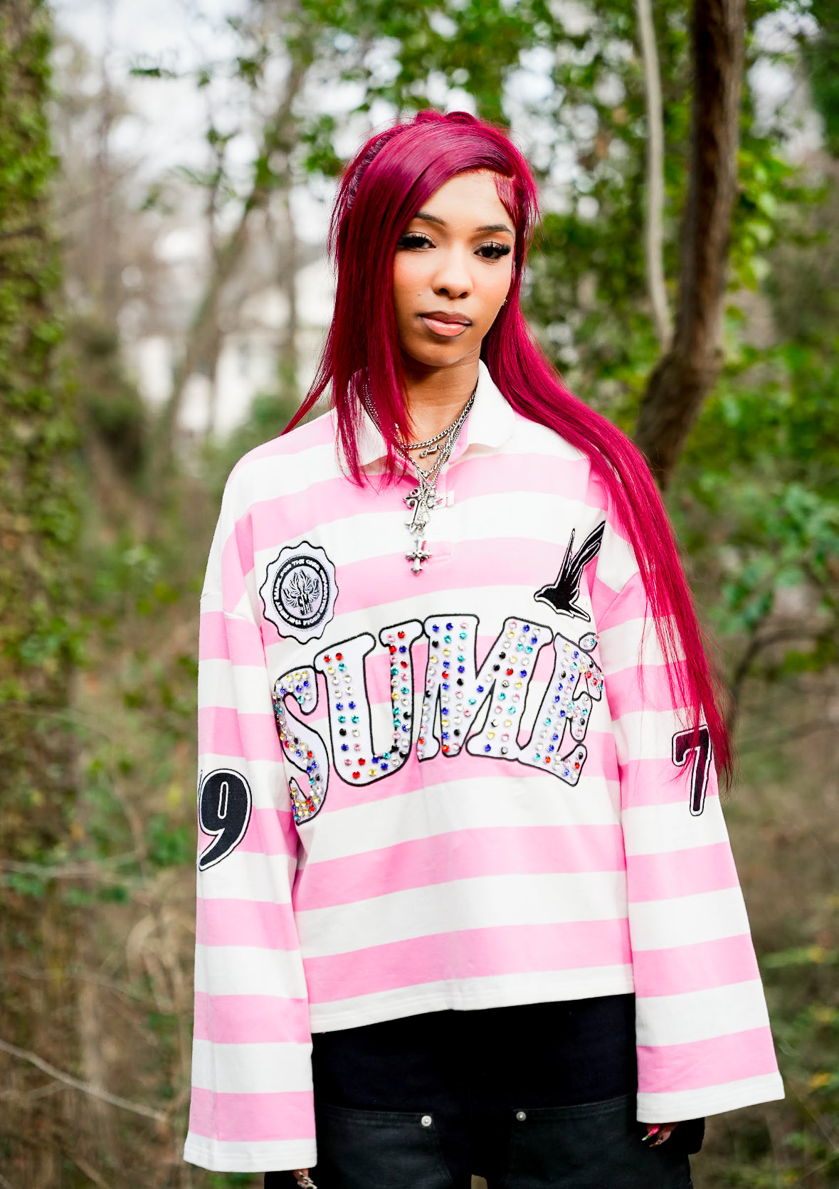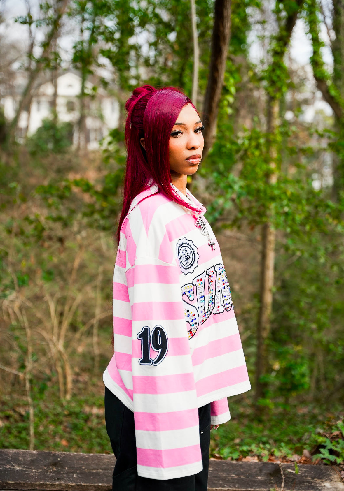 Design: Bold pink-and-white rugby stripes with rhinestone‑embellished logo