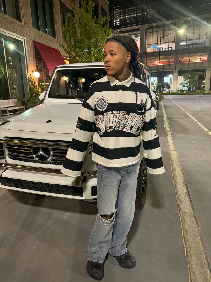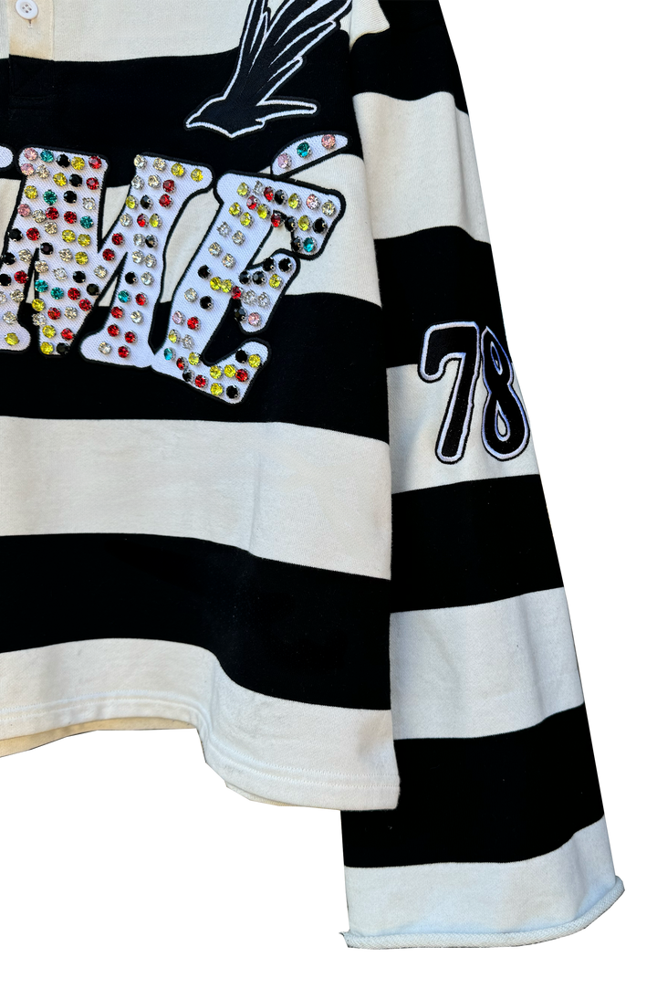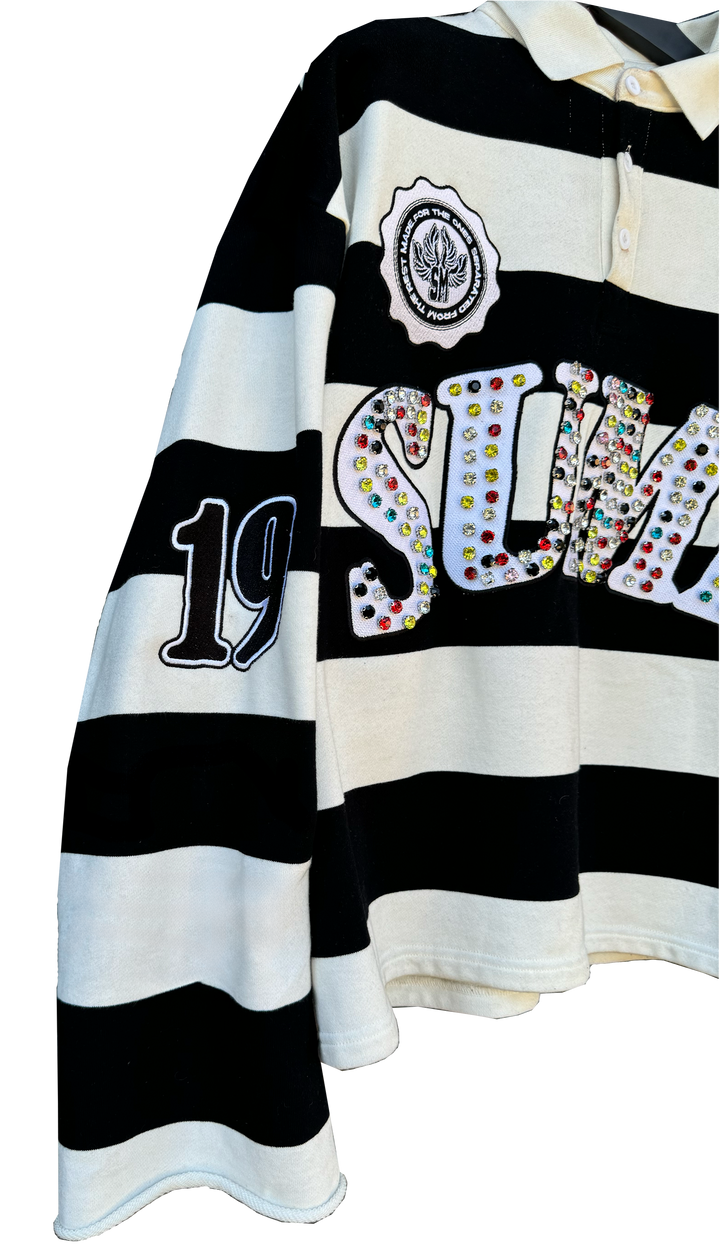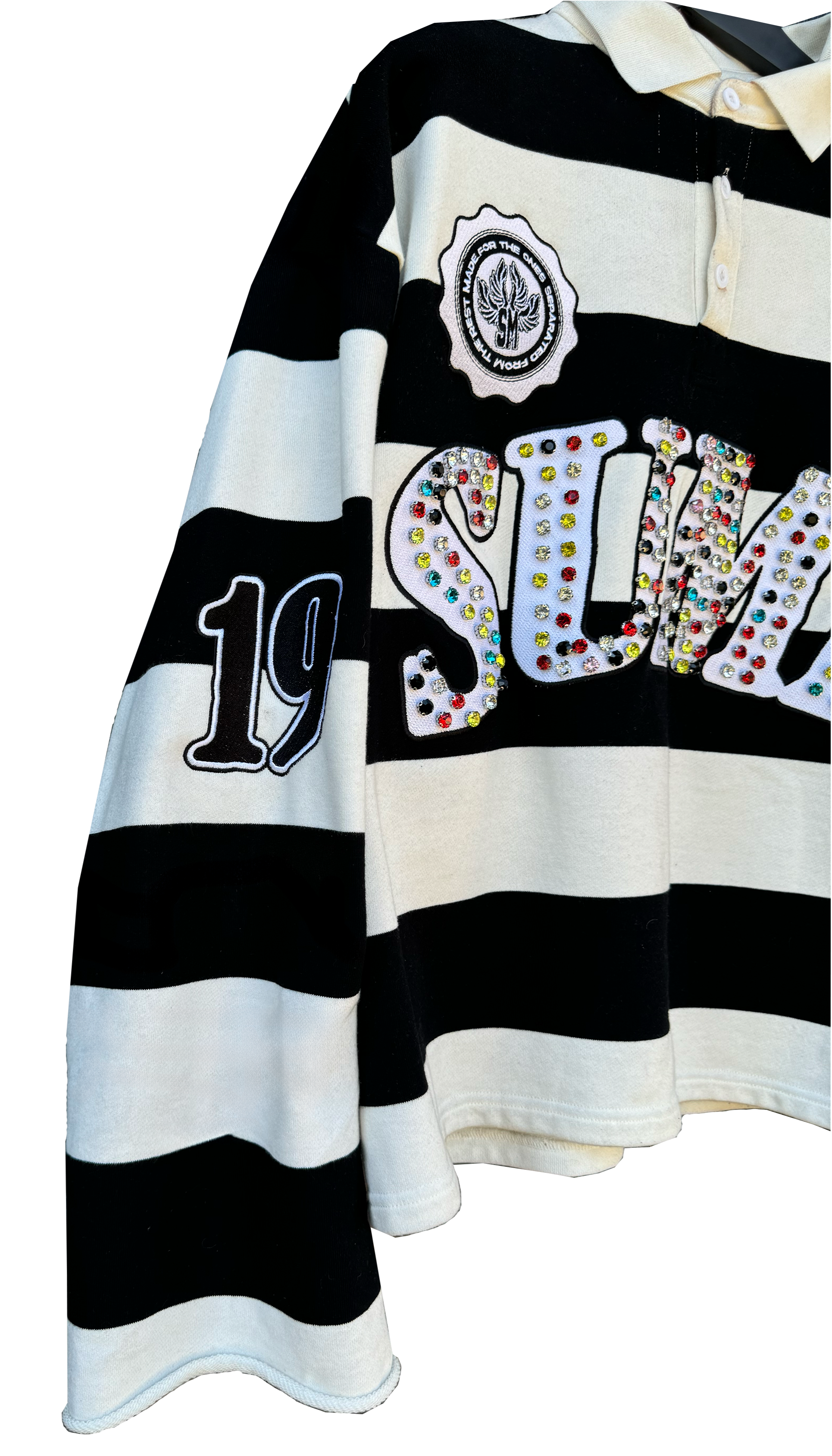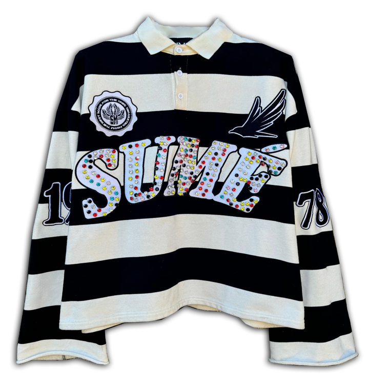 Design: Black & white horizontal stripes with rhinestone-embellished Sumé logo